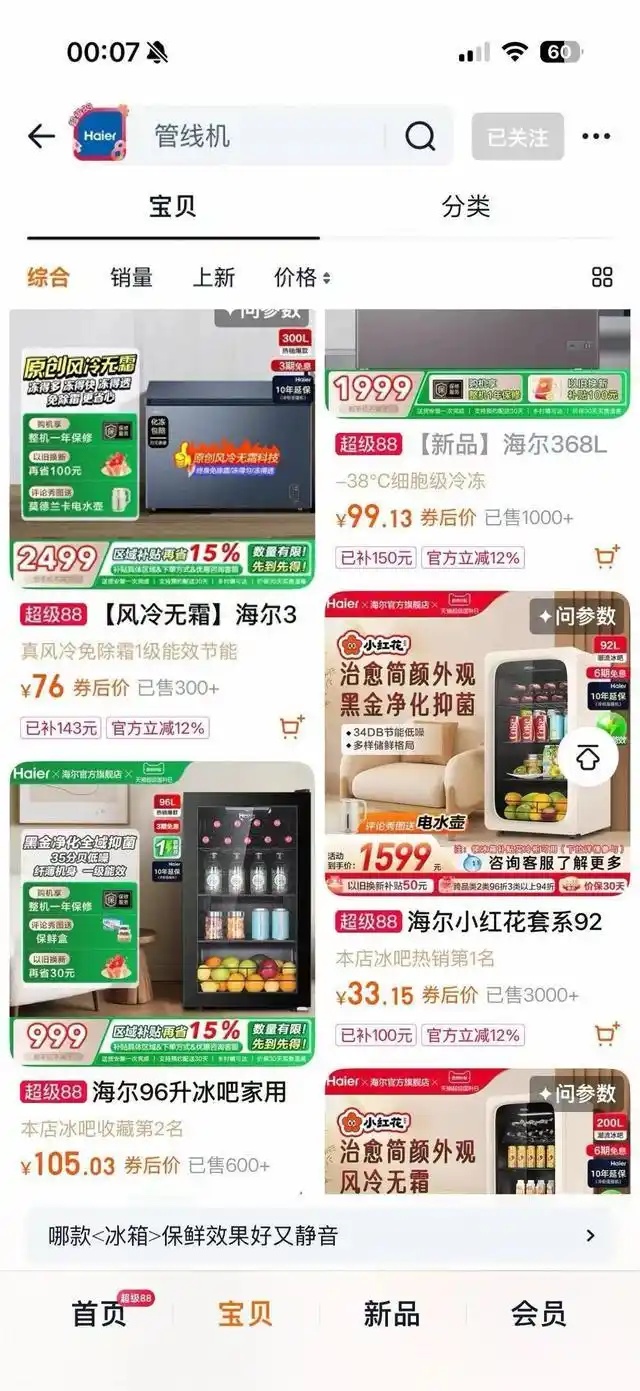 海尔天猫旗舰店冰柜价格异常引抢购,官方回应系操作失误并补偿40元红包