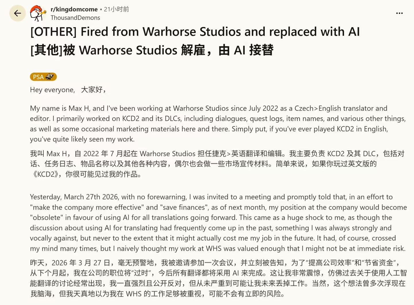 SmartHey3月29日消息,捷克战马工作室(Warhorse Studios)开发人员 Max Hejtmánek 昨天在 Reddit 发文透露,自己即将被公司解雇,原因系AI技术将全面接手其负责的本地化翻译工作。
