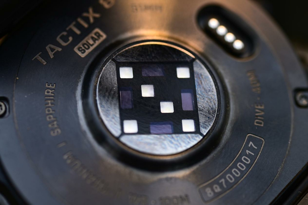 来到背面,可以看到tactix 8采用了我们熟悉的第五代光学心率传感器,相较于前代升级至6组绿色LED光源、4组接收器、2组橙色LED(测血氧饱和浓度)和一个圆形的电气隔离环,比上一代更好的贴合皮肤,即便在更宽松的佩戴或更大幅度的运动下,也能确保心率监测的精准性,为我带来不错的使用体验。