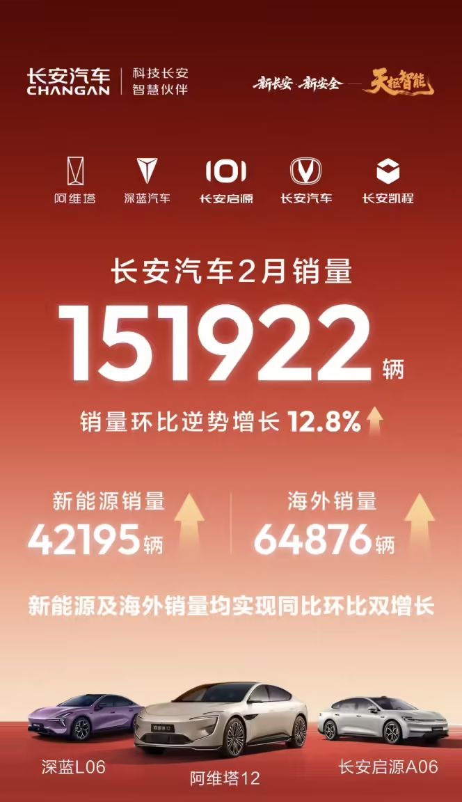 长安汽车2026年2月销量达15.19万辆,环比增长12.8% 推荐 2026-03-02 22:00 字号 小 中 大 SmartHey3月2日消息:长安汽车于近日通过官方公众号公布最新销售数据,2026年2月共售出整车151,922辆,环比增长12.8%,展现出稳健的市场复苏势头。