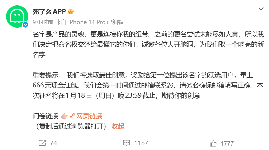 “死了么”APP征名 推荐 2026-01-15 08:42 字号 小 中 大 SmartHey1月15日消息 死了么APP在微博发文征名:名字是产品的灵魂,更是连接你我的纽带。之前的更名尝试未能尽如人意,所以我们决定把命名权交还给最懂它的你们。诚邀各位大开脑洞,为我们取一个响亮的新名字。