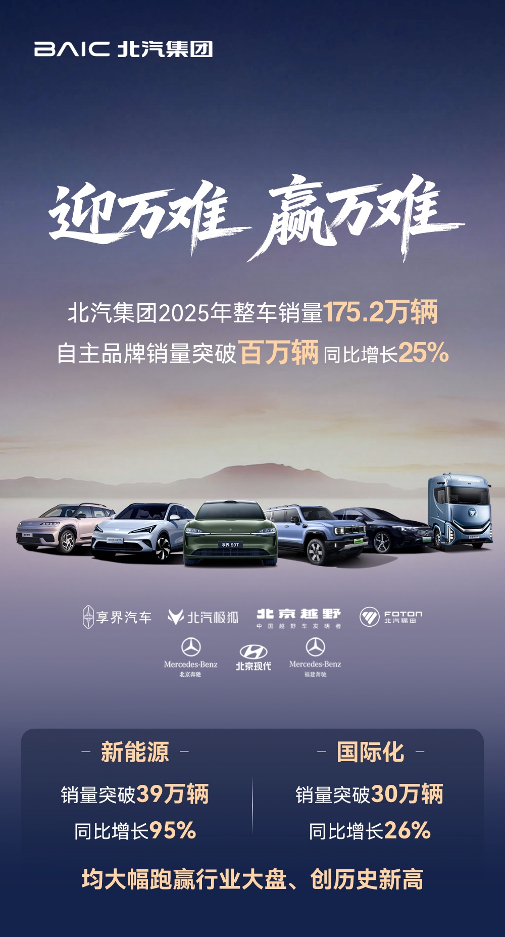 北汽集团2025年销量175.2万辆,自主品牌突破百万辆 推荐 2026-01-09 21:05 字号 小 中 大 SmartHey1月9日消息,北汽集团今日宣布,2025年集团销量达175.2万辆,其中自主品牌销量突破百万辆,同比增长25%。