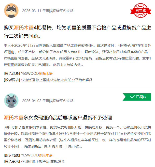 更值得警惕的是高速扩张中浮现的品控隐忧:2020年上海市场监管抽检发现其升降学习桌安全间隙不达标;2021年某款储物柜被判定“标识与实物不符”;2024年有消费者送检称其实木床存在苯系物聚合物超标问题。截至2026年4月,黑猫投诉平台以“源氏木语”为关键词的投诉量逾600条,超六成集中于材质不符、气味刺鼻、色差严重及售后推诿等质量问题。