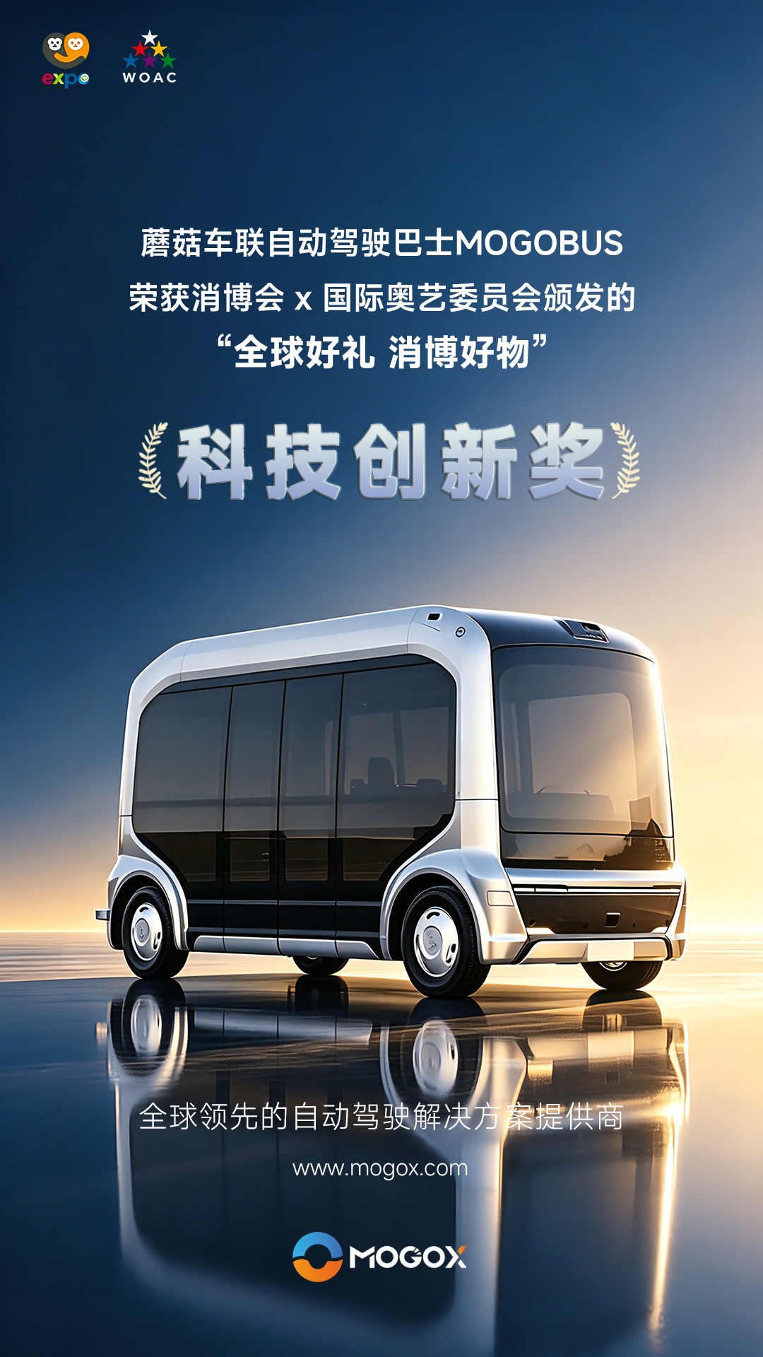 蘑菇车联MOGOBUS自动驾驶巴士斩获第六届消博会科技创新奖 推荐 2026-04-15 14:08 字号 小 中 大 近日,在第六届中国国际消费品博览会(消博会)‘全球好礼 消博好物’评选活动中,蘑菇车联MOGOBUS自动驾驶巴士荣获科技创新奖,成为本次评选中唯一获奖的中国自主研发自动驾驶巴士产品。