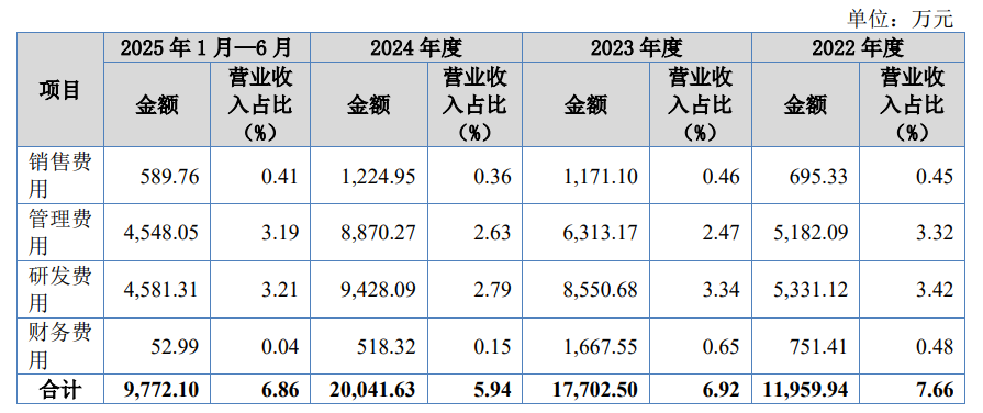 期间费用总额随营收扩张而上升,但费用率保持平稳——各期分别为7.66%、6.92%、5.94%和6.86%。其中销售费用占比极低(0.36%—0.46%),管理费用和研发费用呈增长趋势。