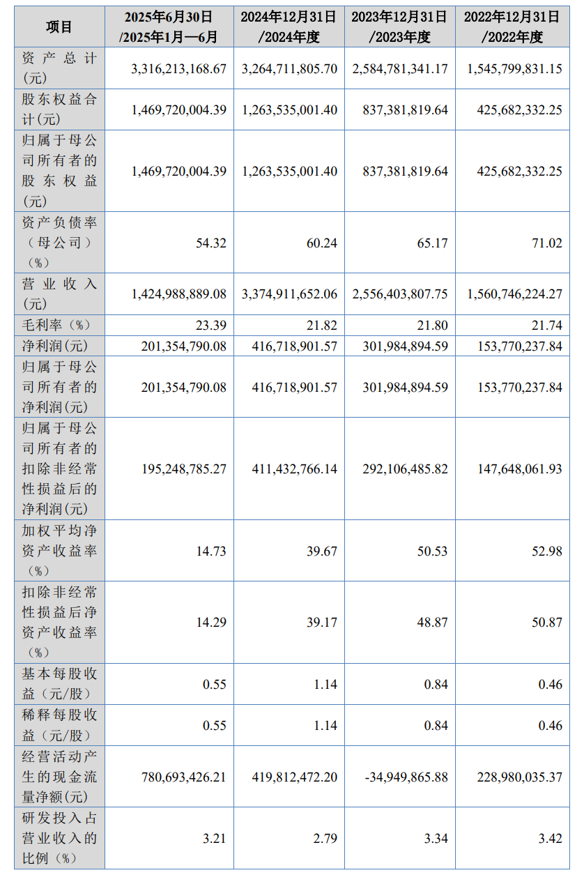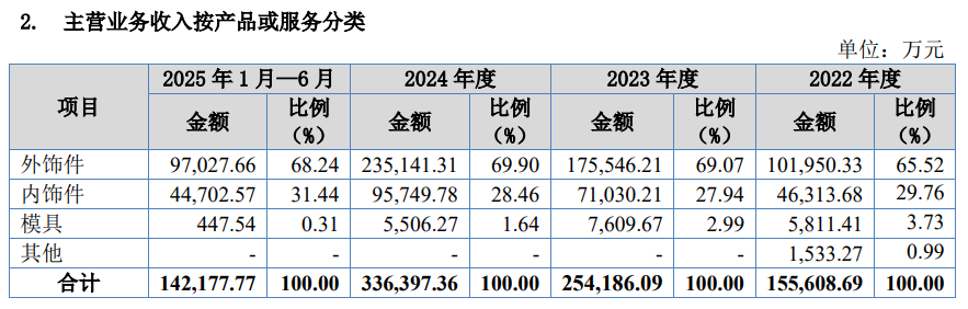 乔路铭科技主营业务涵盖汽车内饰件、外饰件及配套模具。数据显示,2022年至2025年上半年,公司营业收入分别为15.61亿元、25.56亿元、33.75亿元和14.25亿元;对应净利润为1.54亿元、3.02亿元、4.17亿元和2.01亿元。