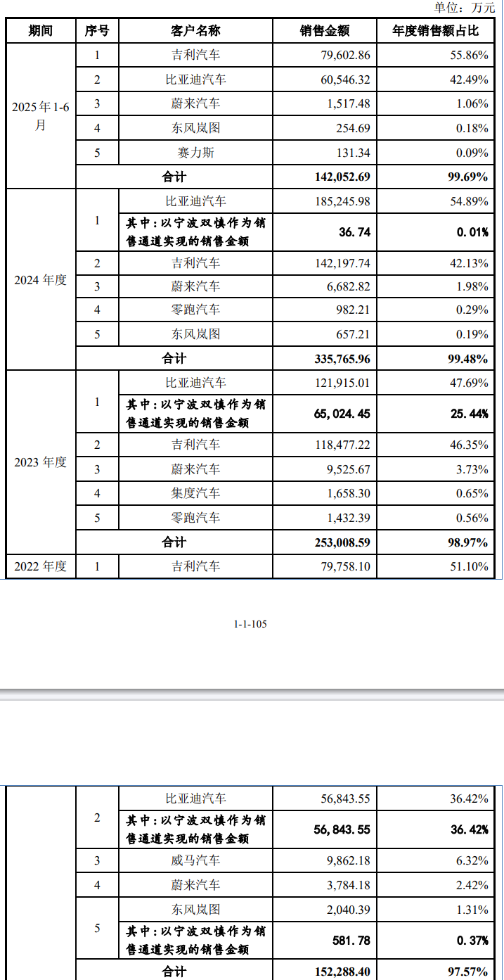 高客户集中度系汽车零部件行业普遍特征,公司较早通过主要客户供应商体系认证,与比亚迪、吉利等合作稳定且持续深化,2022—2024年对其销售规模呈稳健增长态势。