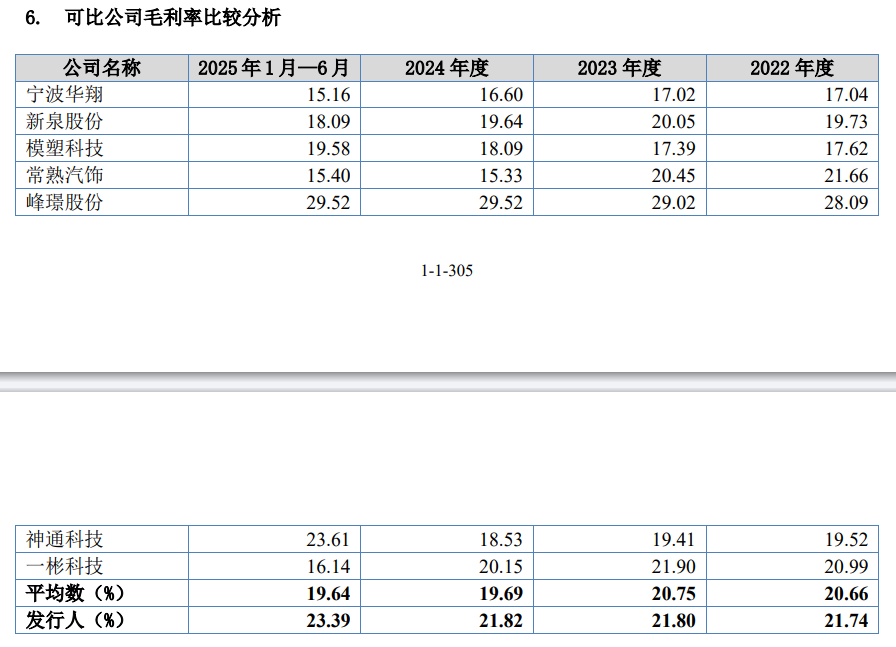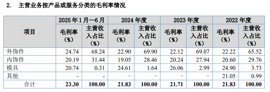 公司主营业务毛利率总体保持稳定,2022—2024年维持在21.7%—21.8%区间,2025年1—6月升至23.30%,提升1.47个百分点;其中外饰件毛利率由22.22%提升至24.74%,表现优于整体。