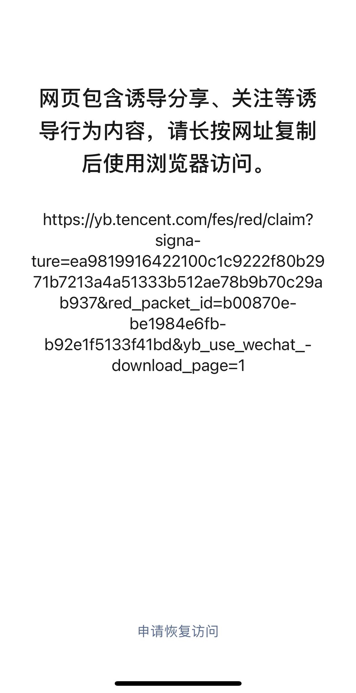 2月4日,SmartHey2月4日消息:元宝红包活动的分享链接在微信内已无法直接跳转,用户需手动复制链接至外部浏览器方可打开并继续领取红包。
