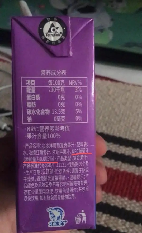 SmartHey4月10日消息,据湖北经视直播报道,近日有网友发帖质疑,北冰洋一款葡萄复合果汁在包装正面醒目标注“添加NFC果汁”,但配料表显示NFC果汁含量仅为0.005%(即十万分之五),引发广泛讨论。不少网友调侃:“这跟一盒只滴一滴有什么区别?”