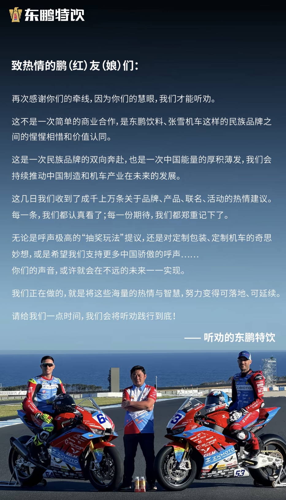 “一个被雅马哈放弃的车手,一个初生的国产机车品牌,一个被网友喊话后果断出资5万元支持的民族饮料企业。”这则广为流传的总结,将商业合作升华为情感共振。东鹏饮料在官方抖音回应称:“这不是一次简单的赞助,而是两个民族品牌的价值认同与双向奔赴,是中国能量的厚积薄发。”