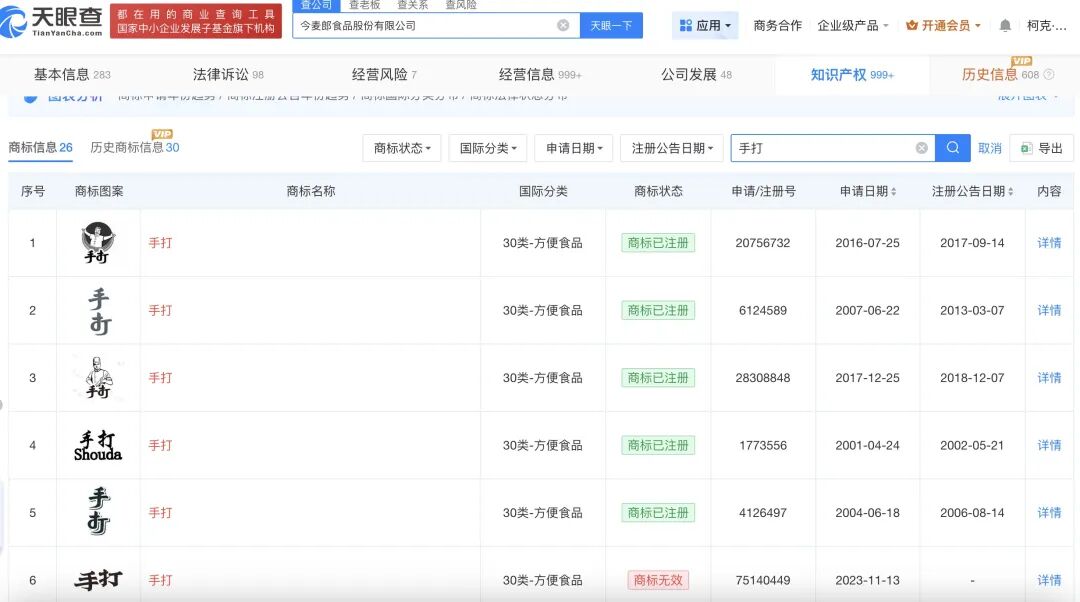 天眼查知识产权数据显示,今麦郎食品股份有限公司自2004年至2023年持续布局“手打”相关商标,已成功注册多枚含“手打”字样的方便食品类商标,涵盖第30类(方便面、挂面等)核心品类。