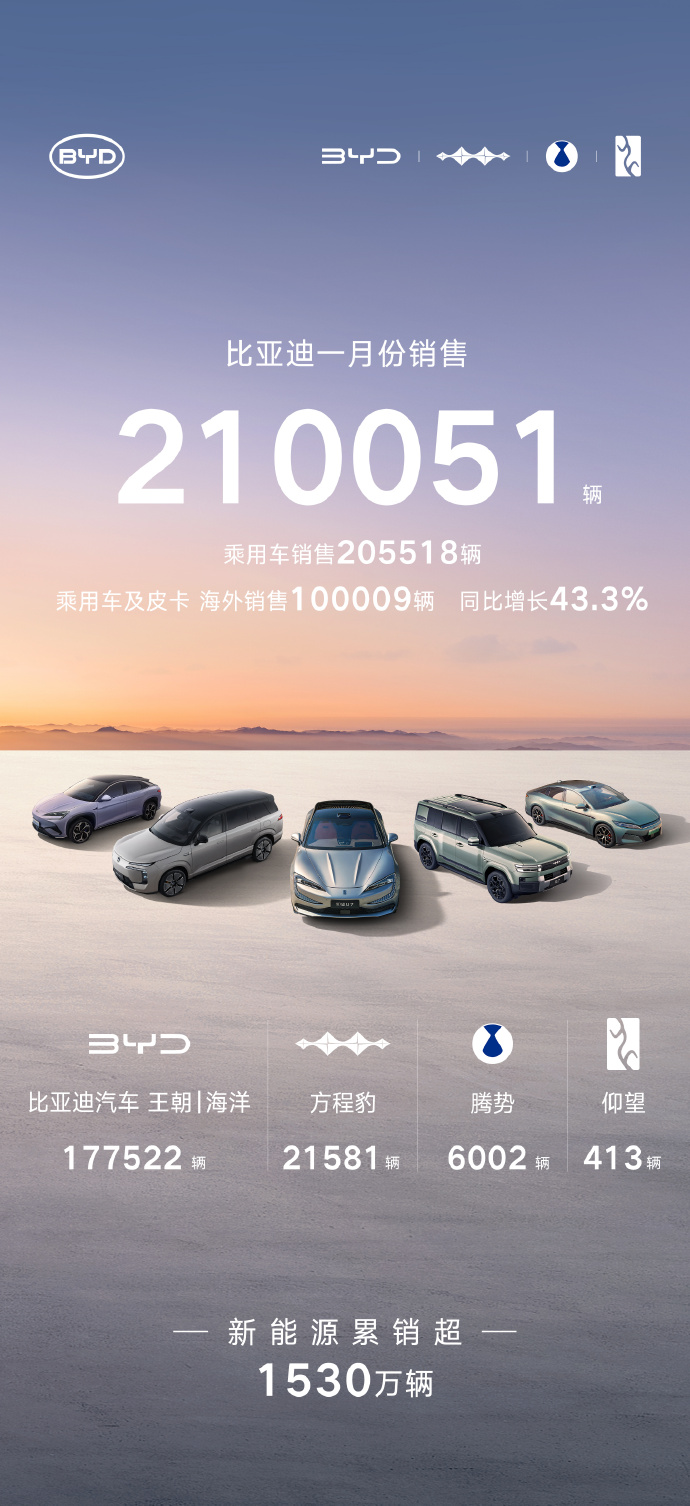 比亚迪2026年1月新能源汽车销量突破21万辆 推荐 2026-02-01 19:11 字号 小 中 大 SmartHey2月1日消息:2026年1月,比亚迪新能源汽车单月销量达210,051辆,持续领跑国内新能源汽车市场。