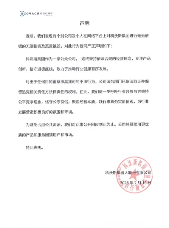 科沃斯就网络不实指控发布严正声明:已依法取证并保留追责权利