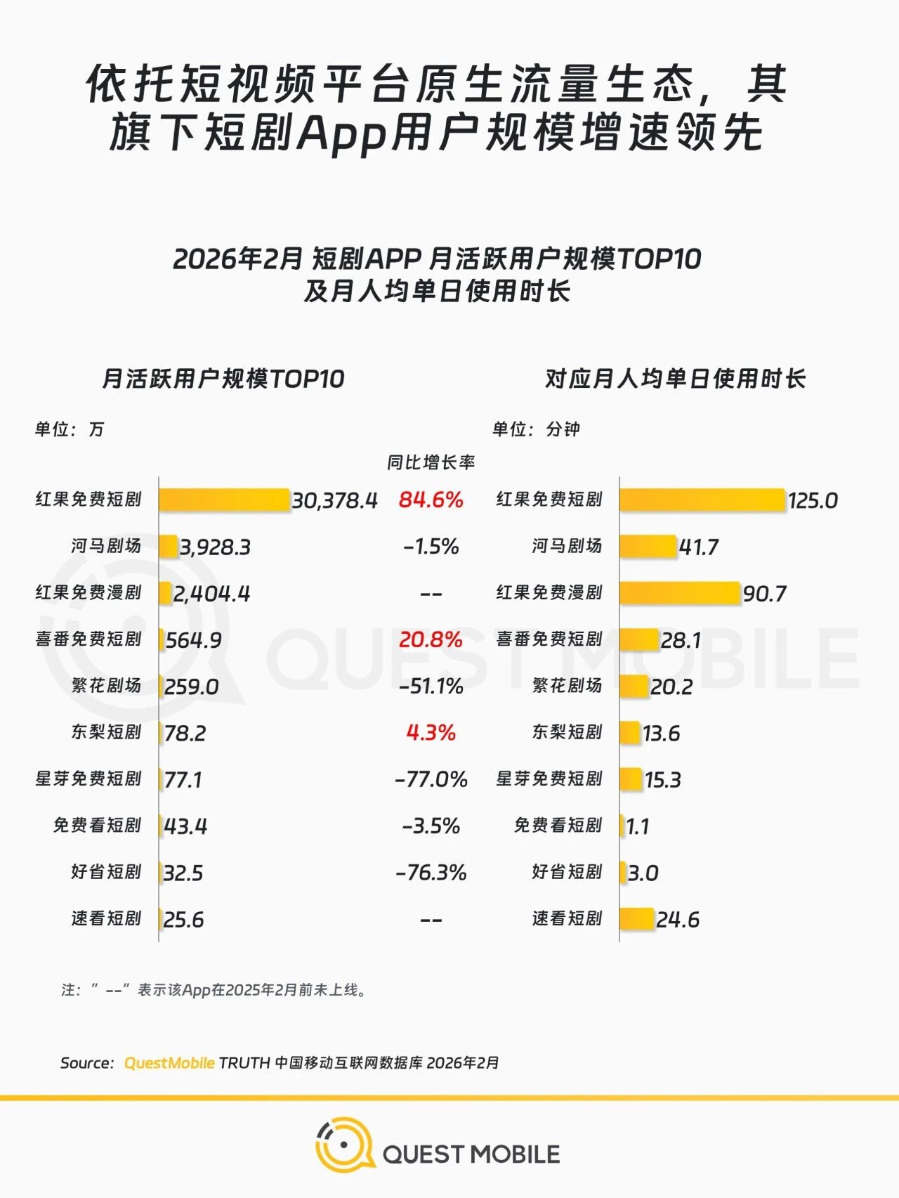 在短剧APP用户规模TOP10榜单中,各平台增速明显分化:头部平台持续领跑,中小平台则面临流量收窄压力,行业集中度进一步提升;而依托短视频生态原生流量优势的平台——如红果免费短剧、喜番免费短剧——成功实现差异化突围。