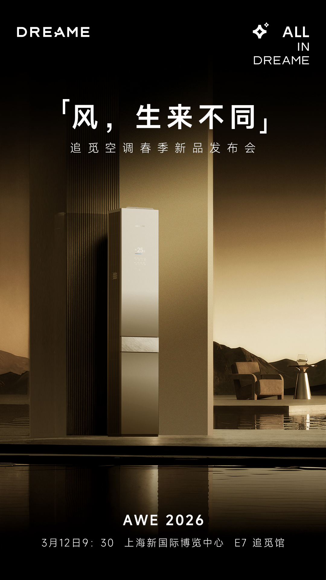 作为全球三大家电及消费电子展之一,2026年中国家电及消费电子博览会(AWE 2026)将于3月12日在上海新国际博览中心盛大启幕。全球高端科技品牌追觅科技以“追觅宇宙 ALL IN DREAME”为主题重磅亮相。开幕首日,追觅空调春季新品发布会暨经销商签约仪式将同步举行,正式推出旗下首款全隐嵌柜机空调D60——该产品既是追觅宇宙场景生态的核心旗舰,亦以全隐嵌艺术设计与全球首创双机械臂驭风技术,重新定义未来家居空气管理新标准。
