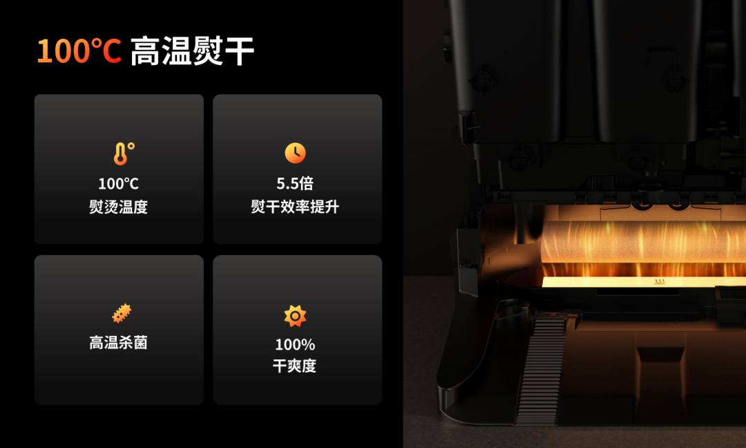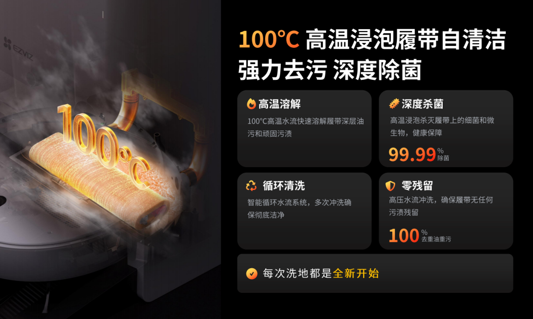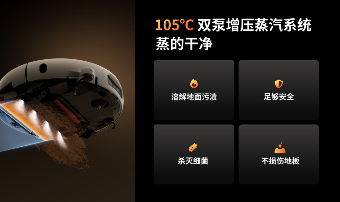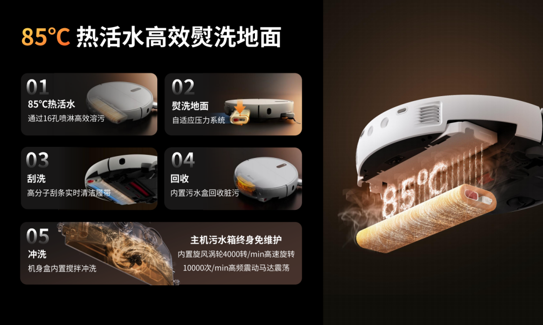 而HotSteam Wash澎湃蒸洗双热系统,则由105℃双泵增压蒸汽模块与85℃黄金热活水熨烫模块构成:前者以瞬时高温蒸汽瓦解顽固油污并高效杀菌;后者实时清洁滚筒履带,确保整机全程洁净无残留。整套流程覆盖“蒸汽预处理→热水洗地→双重杀菌→智能控水速干”,实现除菌率99.9%、无水渍、免人工干预的闭环清洁体验。