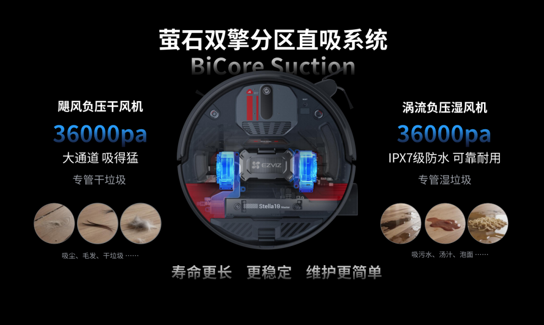 其中,BiCore Suction双擎分区直吸系统首次实现“干吸”与“湿吸”物理级分离:飓风负压干风机专注处理毛发、灰尘等干垃圾;涡流负压湿风机独立应对汤汁、泡面等湿垃圾及混合污物。双风道互不干扰,从源头杜绝异味与二次污染,真正达成“即拖即干、地面清爽”的洁净标准。