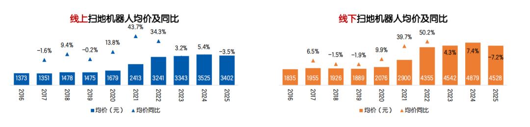 奥维云网数据显示,线上扫地机器人均价从2016年的1373元升至2024年的3525元,线下均价同期由1835元涨至4879元;虽2025年线上、线下价格分别微降3.5%和7.2%,整体仍处历史高位区间。