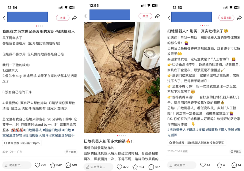 然而,高价格并未同步带来高体验。江苏省消保委2025年调查指出,物品卡滞(64.67%)、导航不智能(47.58%)、边刷与滚轮缠绕毛发且难清理(38.49%)是三大投诉焦点。社交平台上的大量“避雷帖”,进一步折射出用户对当前产品实用性的普遍焦虑。