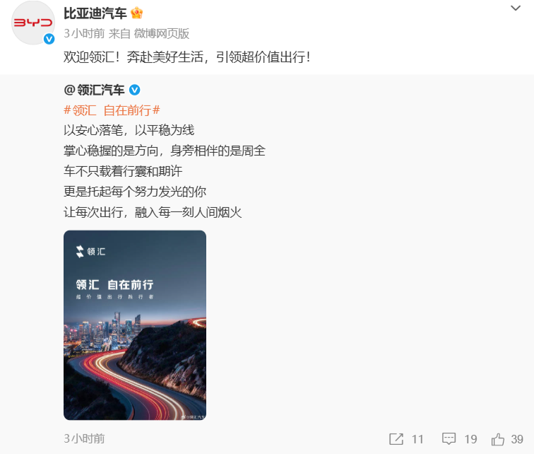 比亚迪官方微博随即转发并诚挚回应:‘欢迎领汇汽车加入出行新生态!携手奔赴美好生活,共同引领高价值、有温度的超价值出行时代。’