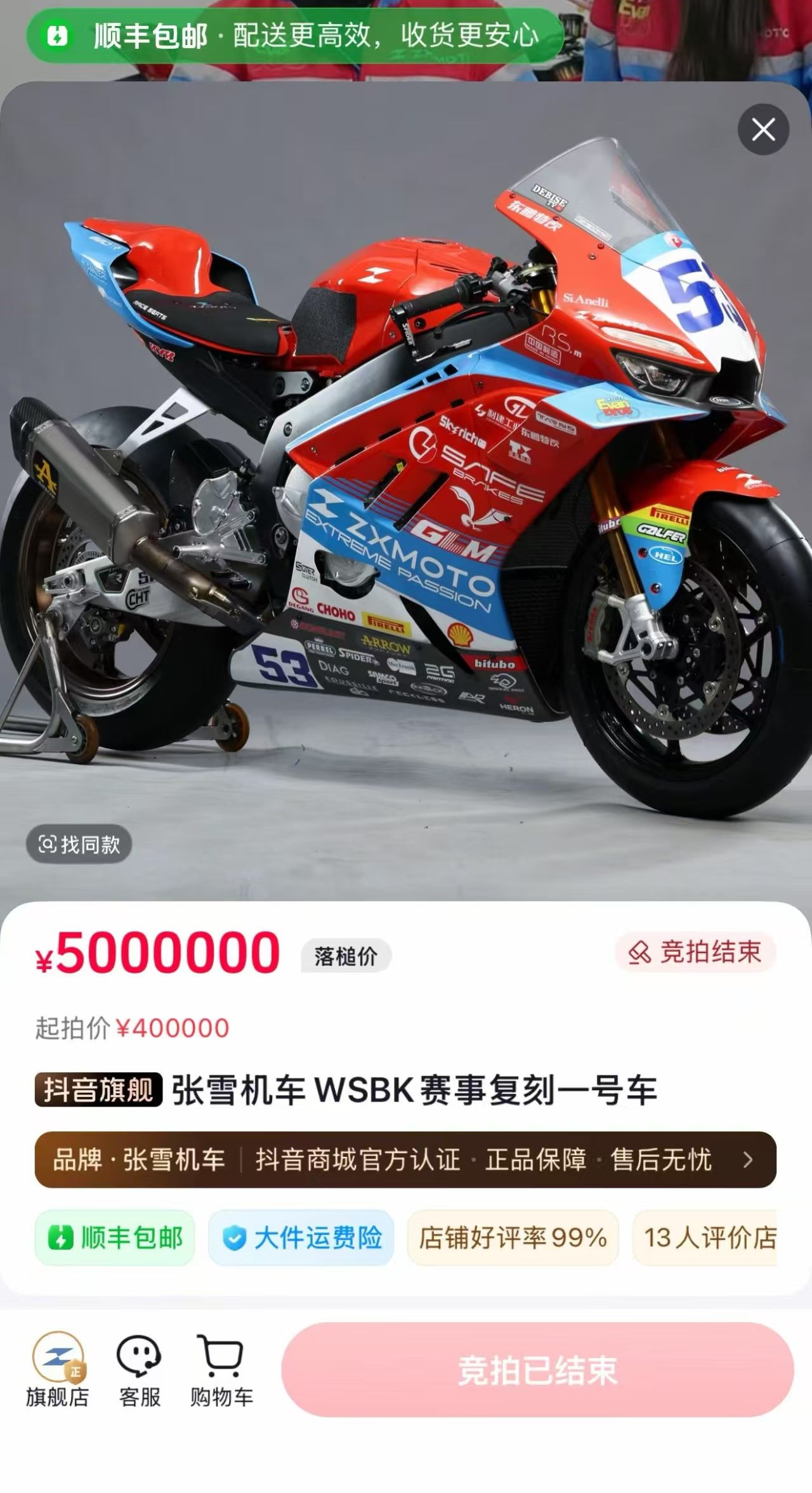 SmartHey4月10日消息,今日20时,张雪机车创始人张雪在直播间公开拍卖其WSBK(世界超级摩托车锦标赛)夺冠赛车的53号复刻版。