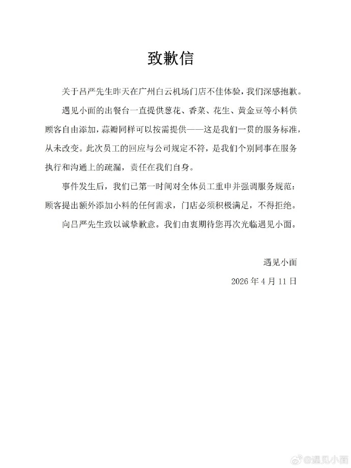 4月11日,遇见小面官方发布致歉声明,就吕严在该门店遭遇的不佳服务体验诚恳致歉。
