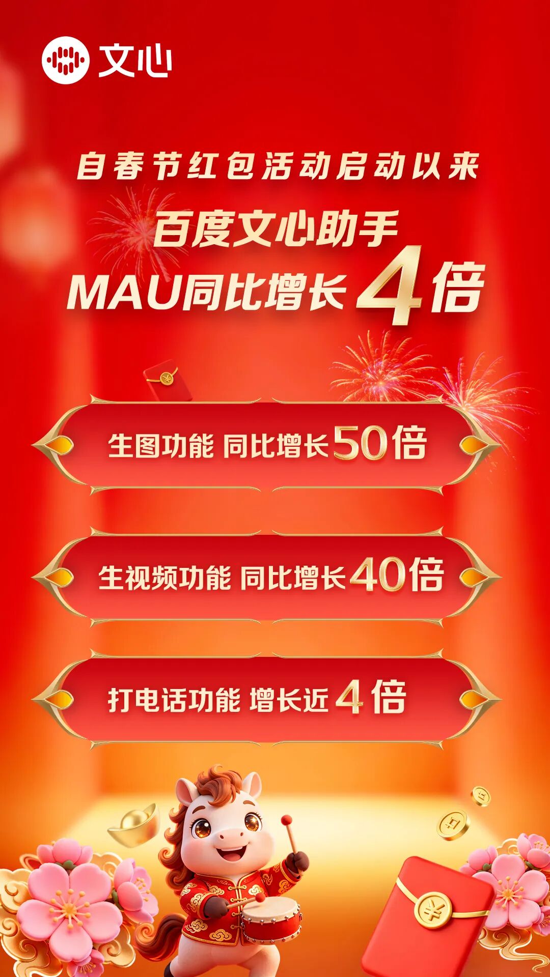 百度文心助手春节红包活动引爆用户增长:生图功能飙升50倍 推荐 2026-02-10 20:16 字号 小 中 大 SmartHey2月10日消息:据百度文心官方公布,自春节红包活动启动以来,百度文心助手月活跃用户数(MAU)同比增长4倍;其中AI生图功能使用量激增50倍,生视频功能增长40倍,语音通话功能亦实现近4倍增长。