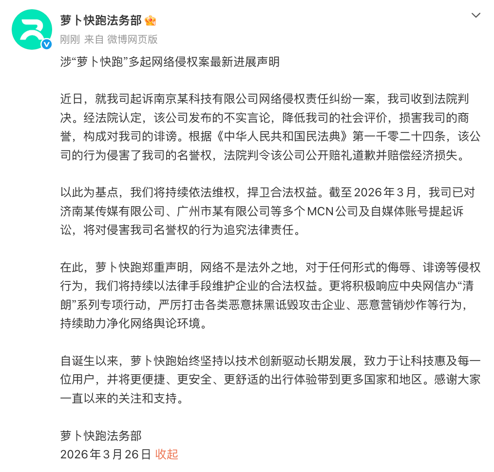此次胜诉并非孤立事件。据萝卜快跑方面披露,截至2026年3月,平台已针对多家MCN机构及自媒体账号发起系列诉讼,重点打击编造谣言、刻意抹黑企业的网络侵权行为,形成常态化、机制化的依法维权态势。