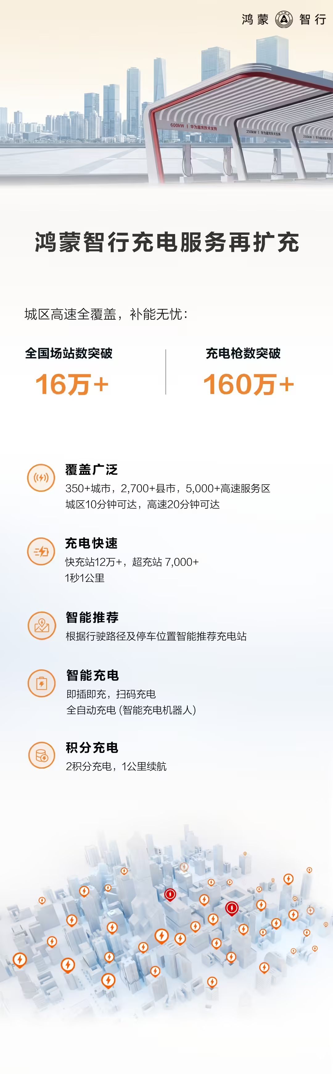 鸿蒙智行充电网络全国突破16万场站、160万充电枪,覆盖超350城及5000+高速服务区