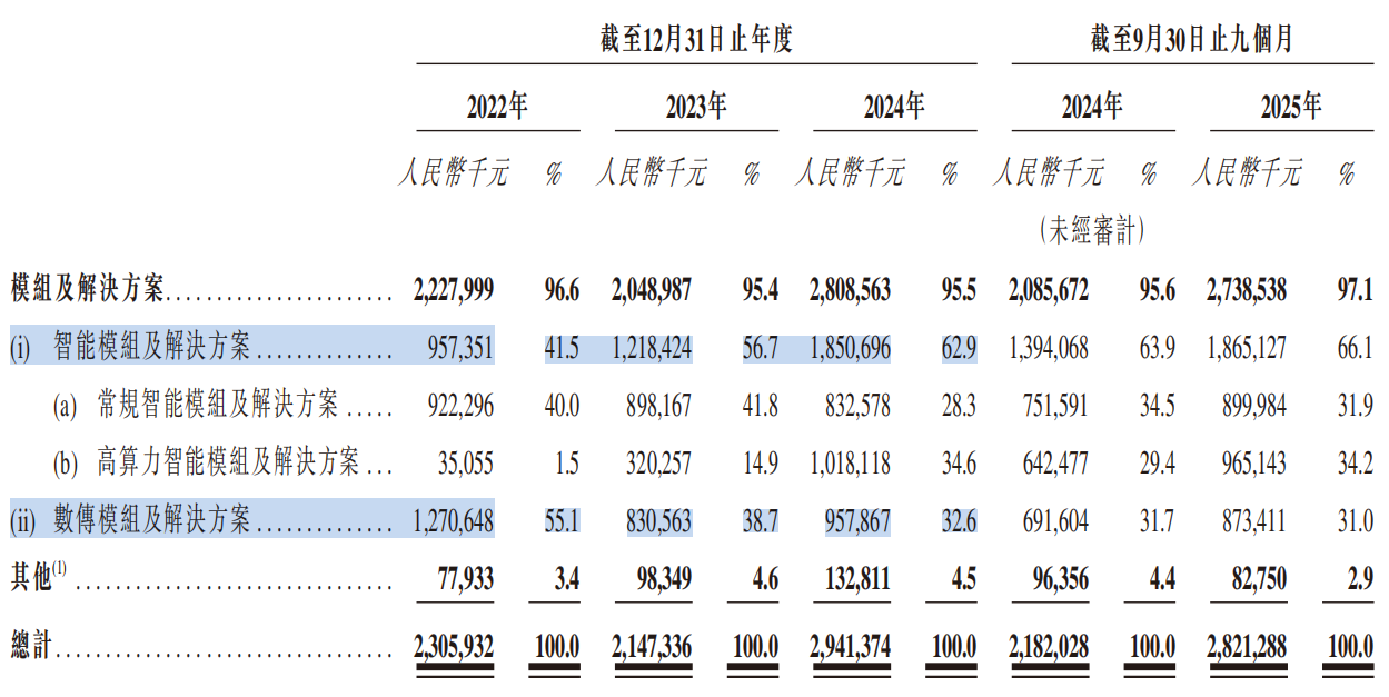 公司产品体系分为两大主线:一是智能模组及解决方案,搭载SoC处理器与智能操作系统,细分为两类——常规智能模组(算力低于8TOPS,侧重多媒体处理与定制化软件支持)和高算力智能模组(算力≥8TOPS,支撑复杂AI算法及边缘推理);二是数传模组及解决方案,专注高可靠性、高吞吐量的数据传输,不搭载智能操作系统。按产品结构划分的收入占比情况如下: