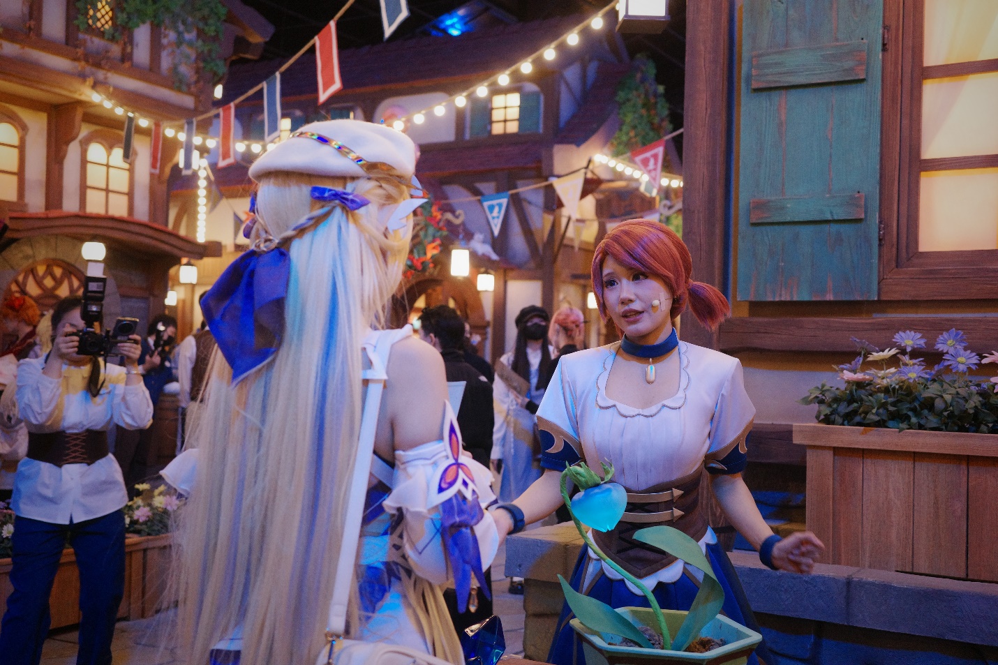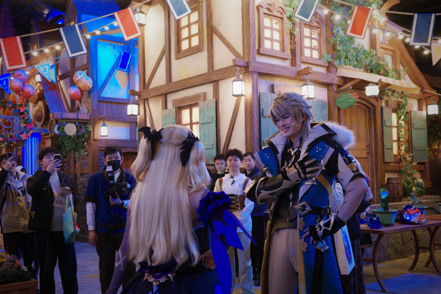 主题区以游戏内节日“羽球节”为叙事核心,实景复刻玩家熟悉的开放世界城市——蒙德城。可莉、法尔伽、菲谢尔等高人气角色全程驻场,与游客实时对话、即兴互动,构建起高度代入的线下冒险氛围。