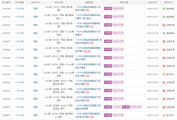 SmartHey2月28日消息,据快科技报道,汽车第三方投诉平台车质网显示,一汽-大众探岳近期遭遇大量车主集中投诉,主要问题为‘变速箱进入紧急运行模式’,涉及车型以2019—2020款为主。