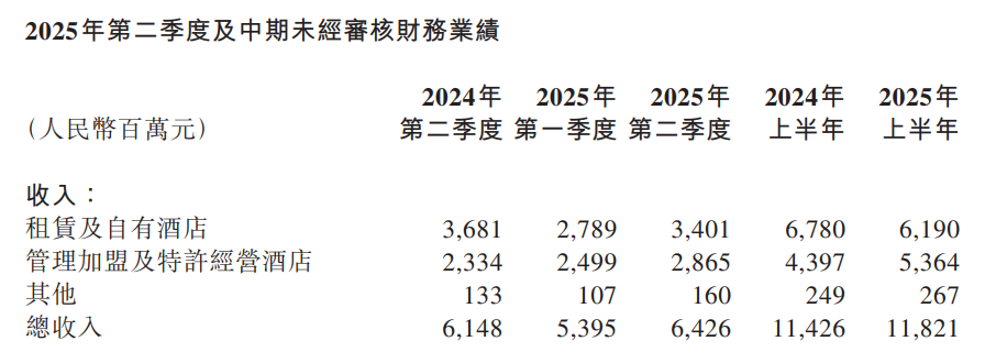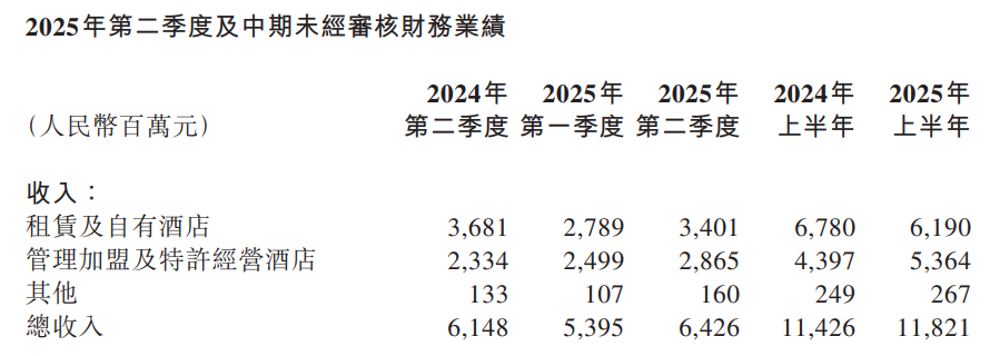 图源:华住集团2025年第二季度及中期未经审核财务业绩公告
