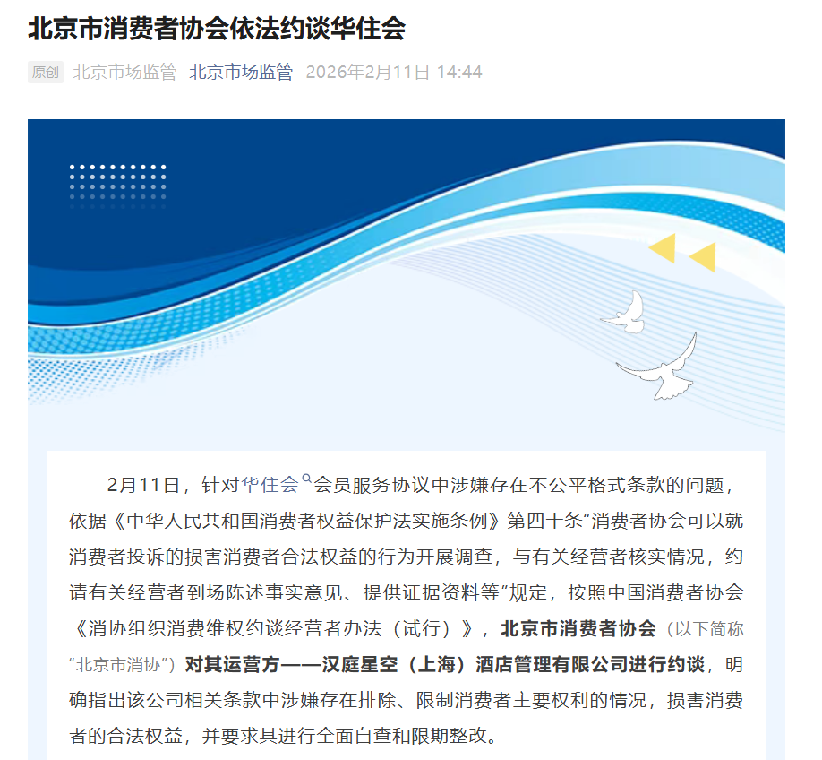 据“北京市场监管”官方公众号2026年2月11日发布的《北京市消费者协会依法约谈华住会》,针对华住会会员服务协议中涉嫌存在不公平格式条款的问题,当日,北京市消费者协会对其运营方——汉庭星空(上海)酒店管理有限公司进行约谈,明确指出该公司相关条款中涉嫌存在排除、限制消费者主要权利的情况,损害消费者的合法权益,并要求其进行全面自查和限期整改。