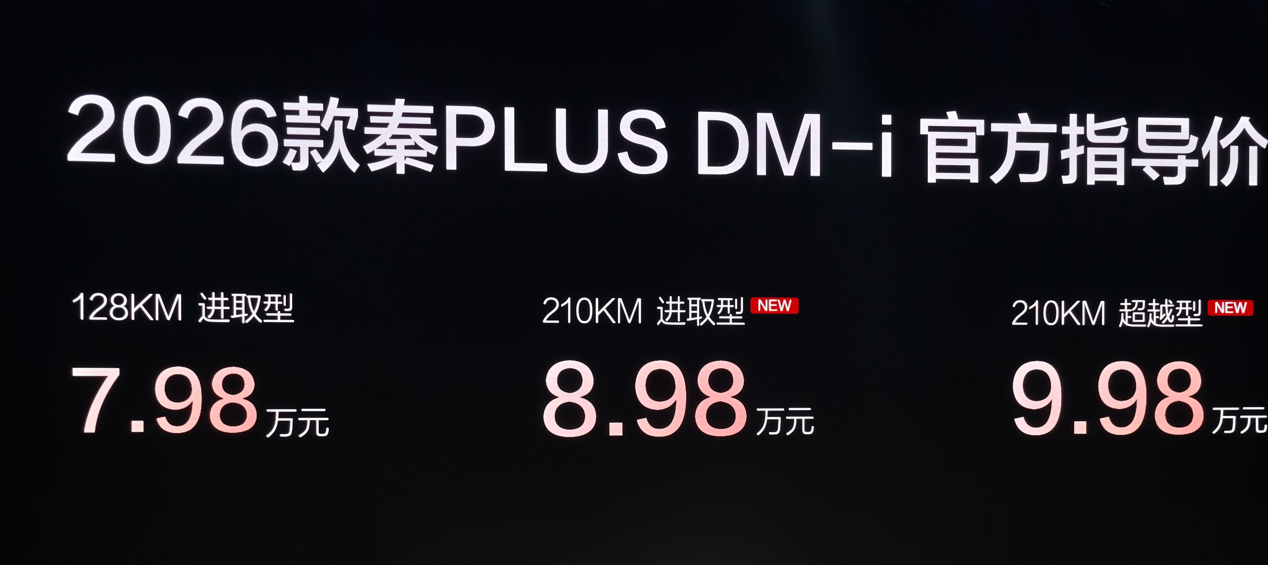 比亚迪2026款秦家族携210KM长续航版登场 推荐 2026-01-09 08:48 字号 小 中 大 1月8日晚,2026款秦家族携210KM长续航版本正式亮相,搭载大容量电池的插电混动车型,纯电续航实现翻倍提升,进一步降低日常通勤成本。此次推出的210KM长续航版售价区间为8.98万元至12.28万元。