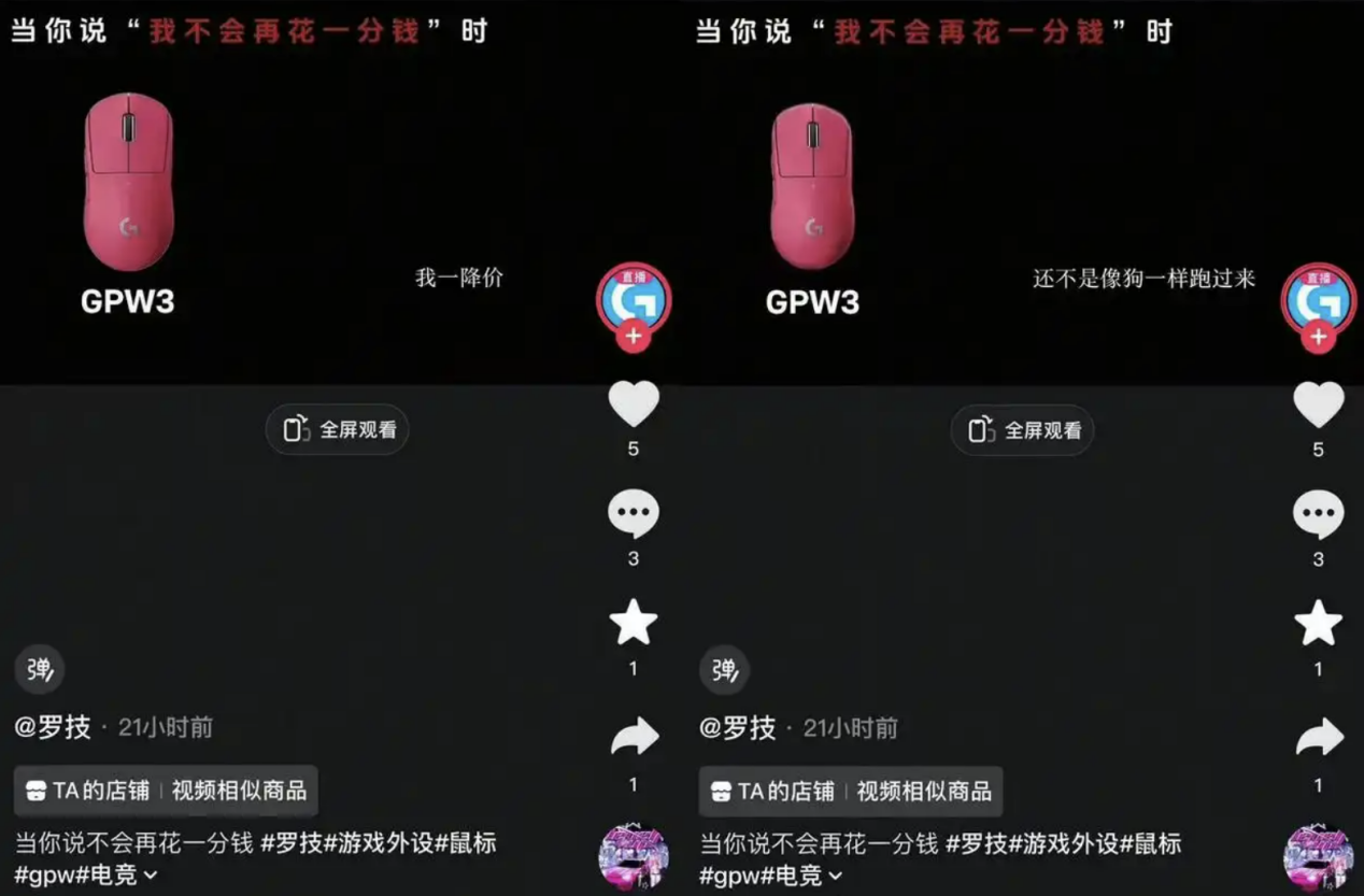 3月26日,罗技G官方旗舰店在抖音发布GPW3无线鼠标宣传视频——全程无参数解析、无场景实测、无技术亮点,仅以一句极具冒犯性的文案收尾:“当你说‘我不会再花一分钱’时,我一降价,还不是像狗一样跑过来。”