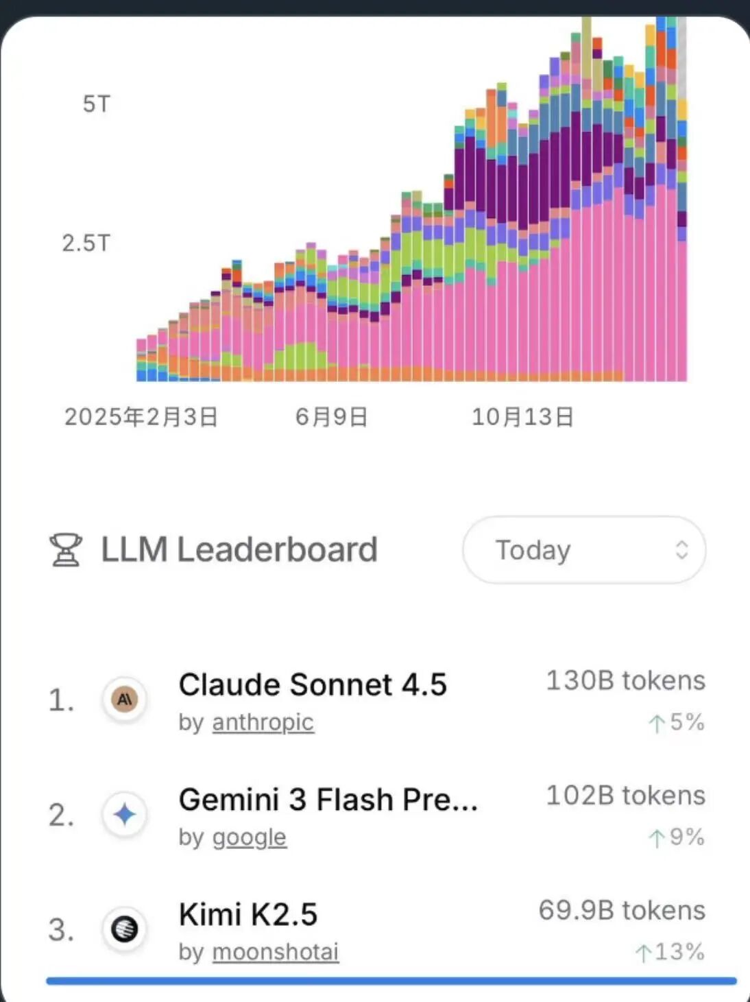在知名大模型聚合平台OpenRouter的实时调用热度排行榜中,Kimi K2.5更跻身全球前三,成为榜单中排名最高的开源模型,仅次于Claude Sonnet 4.5和Gemini 3 Flash两款闭源旗舰模型。